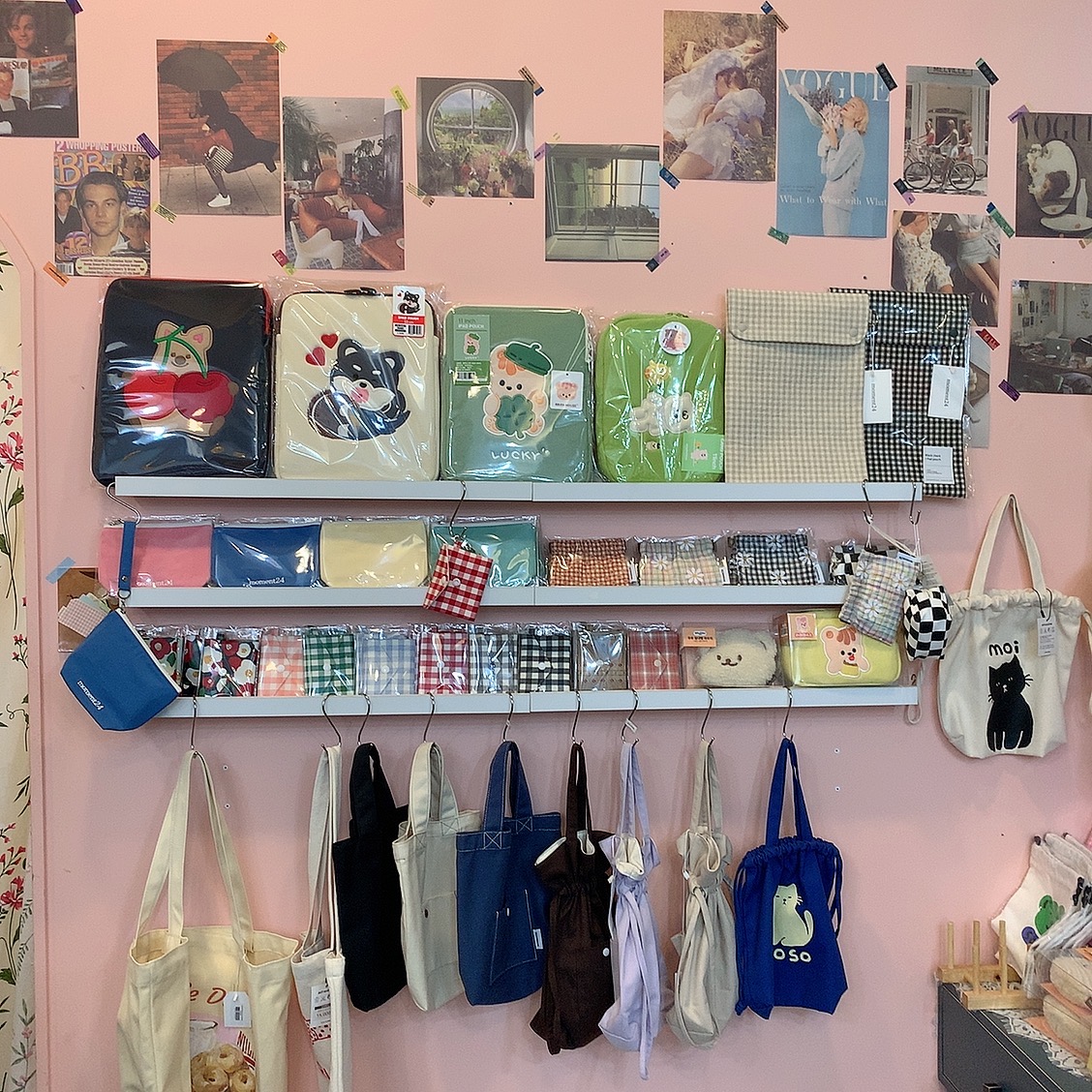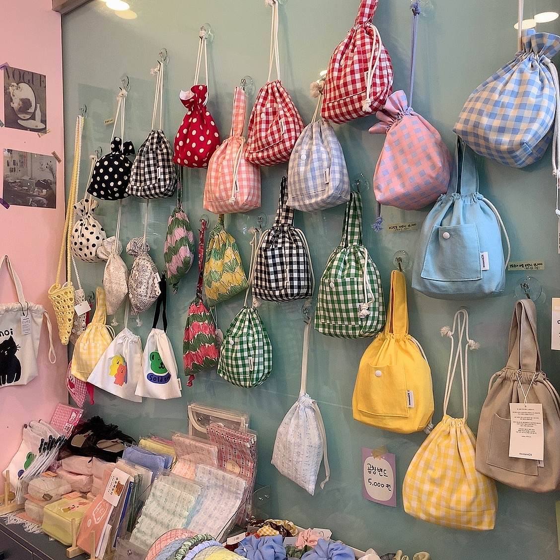알록달록파우치와 에코백이 진열되어 있습니다.