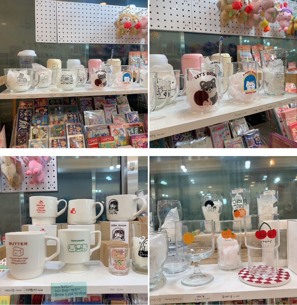 머그잔과 유리잔 소주잔이 진열되어 있습니다.