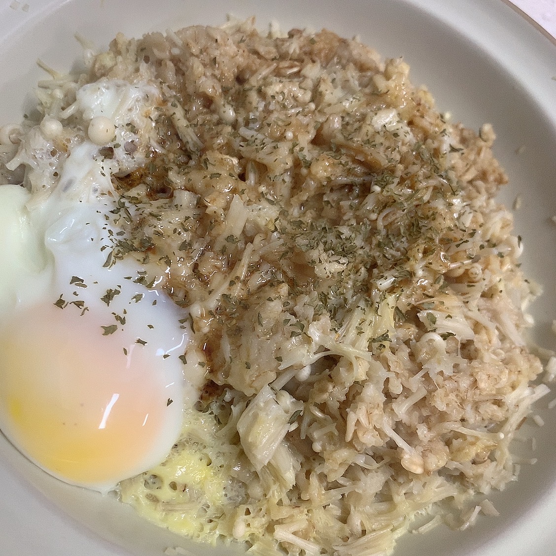 잘 섞은 팽이버섯오트밀밥 위에 계란 한개를 더 투척