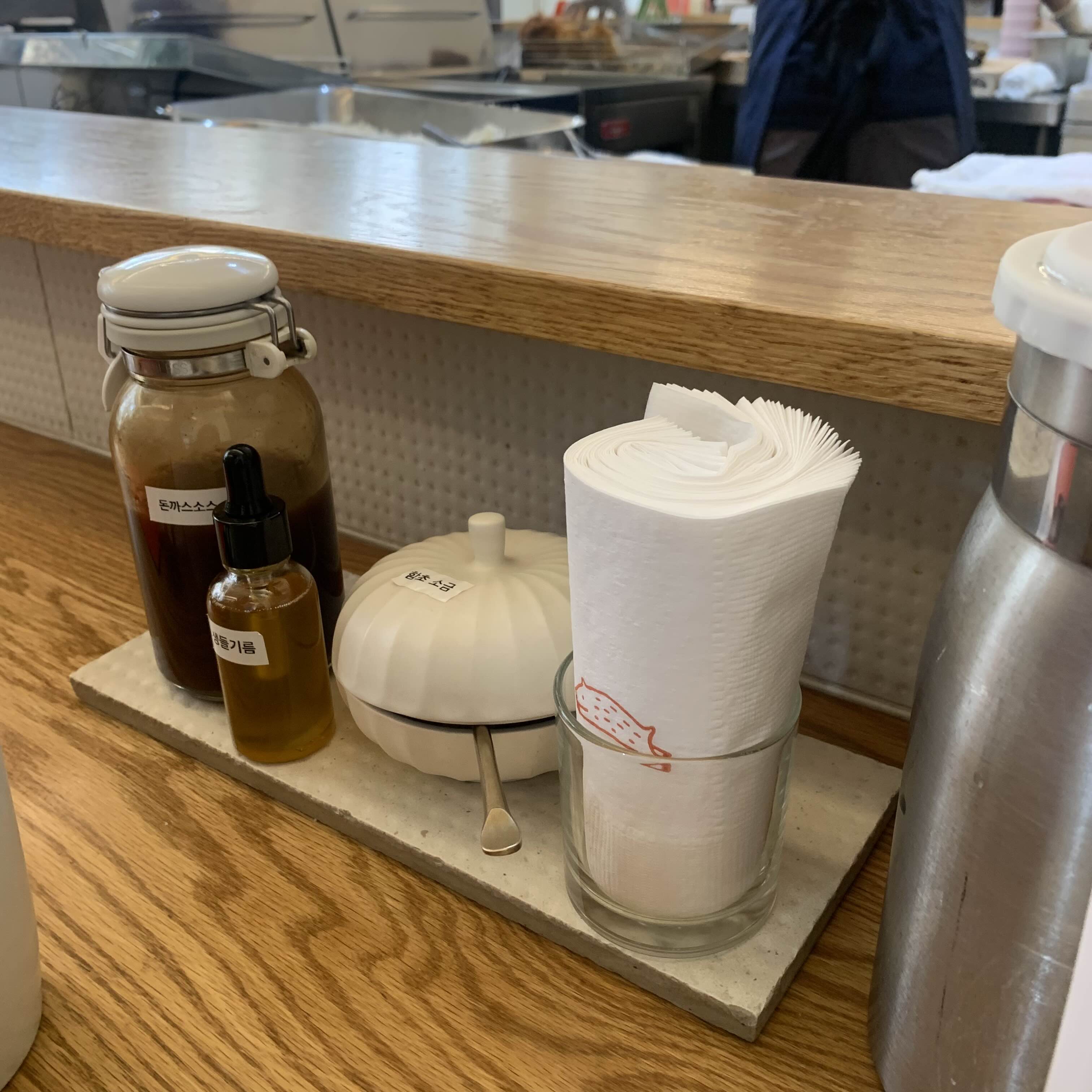 각 자리 앞에는 돈까스소스, 들기름, 함초소금이