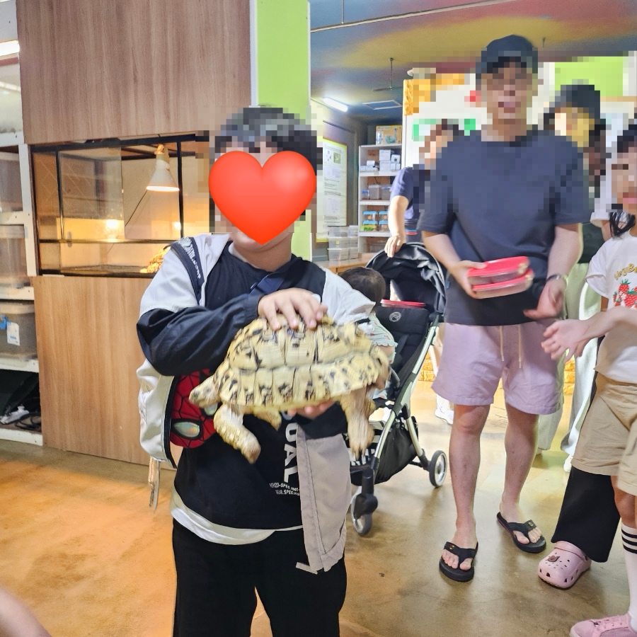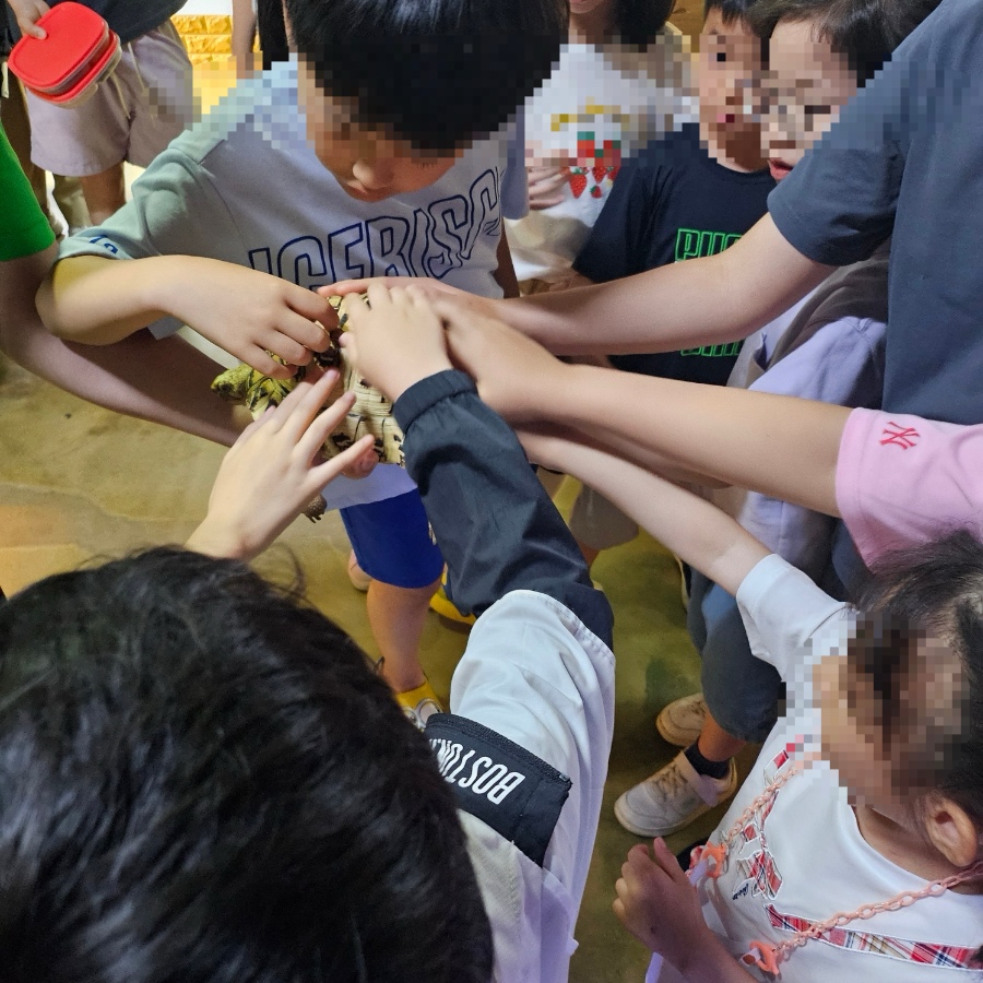 와다다 몰려들어서 거북이 등껍질만지는 아이들