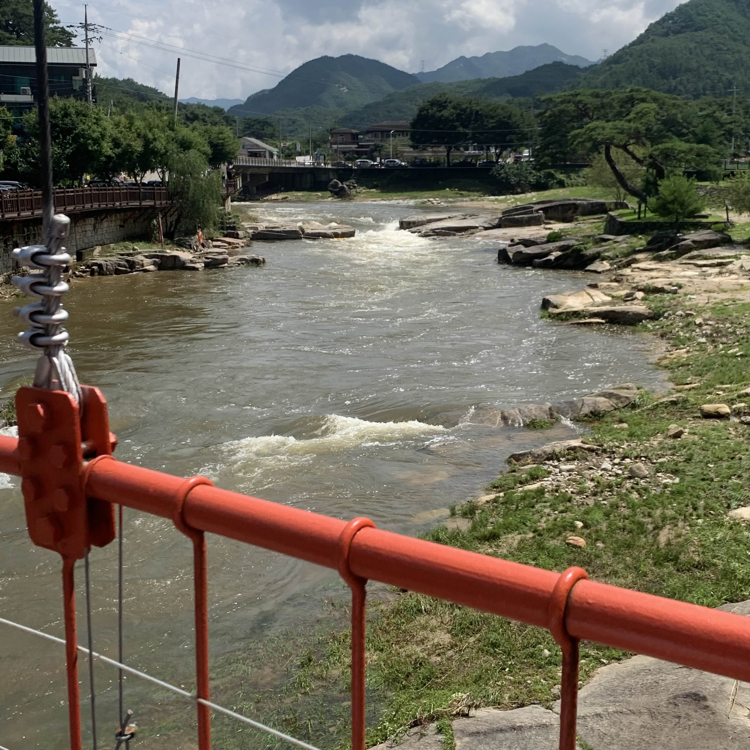 물가를 건너갈 수 있게 주황색 구름다리가 있습니다